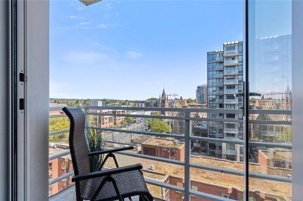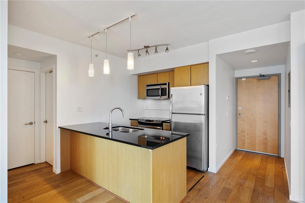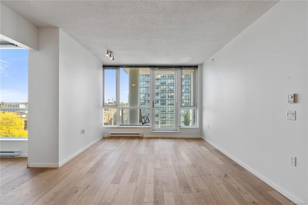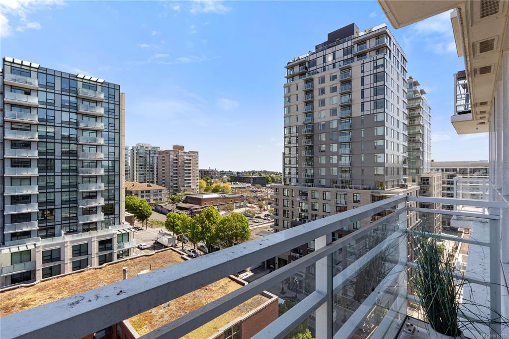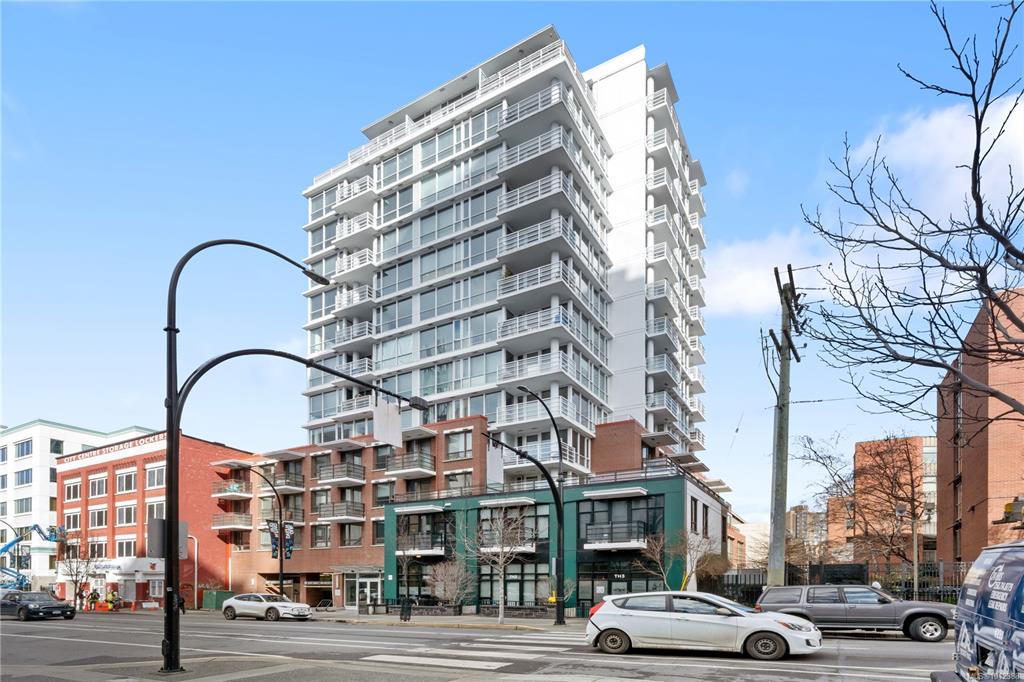 Live steps from everything in this modern 2 bedroom,1 bath condo set in a quality steel-and-concrete building in the vibrant core of downtown Victoria. Soaring 9-ft ceilings, floor-to-ceiling windows, engineered hardwood floors, and a sleek kitchen with quartz countertops and stainless steel appliances create a polished, contemporary feel. The open-concept living space flows to a covered balcony—ideal for morning coffee or winding down with city views. Bedrooms are thoughtfully separated, offering great fle...