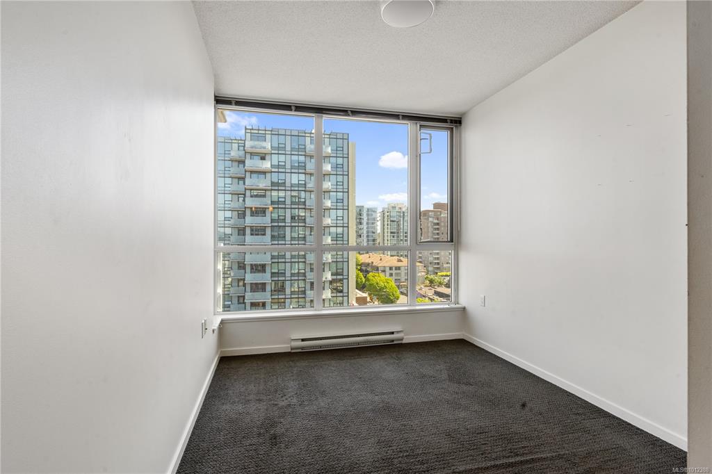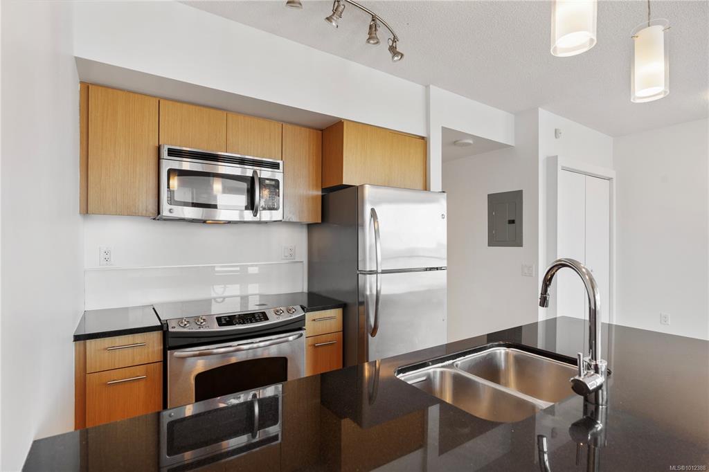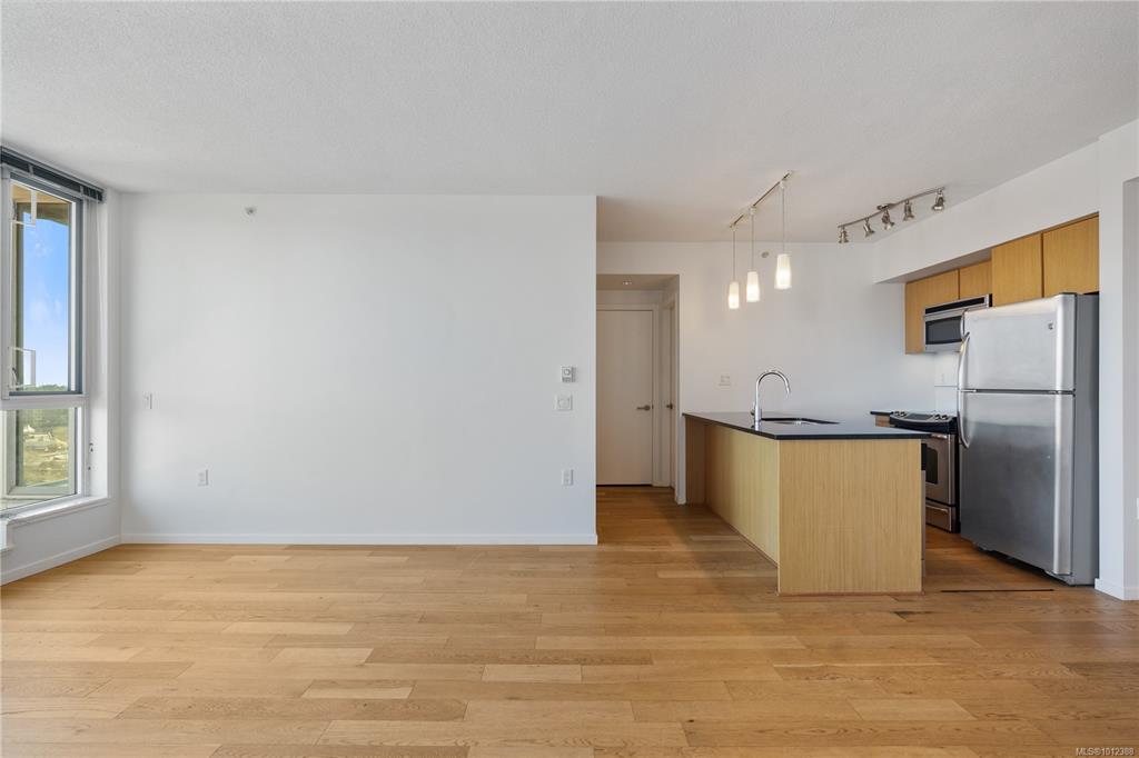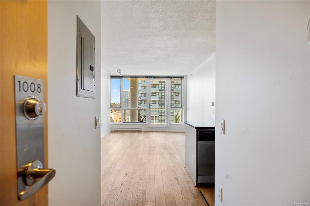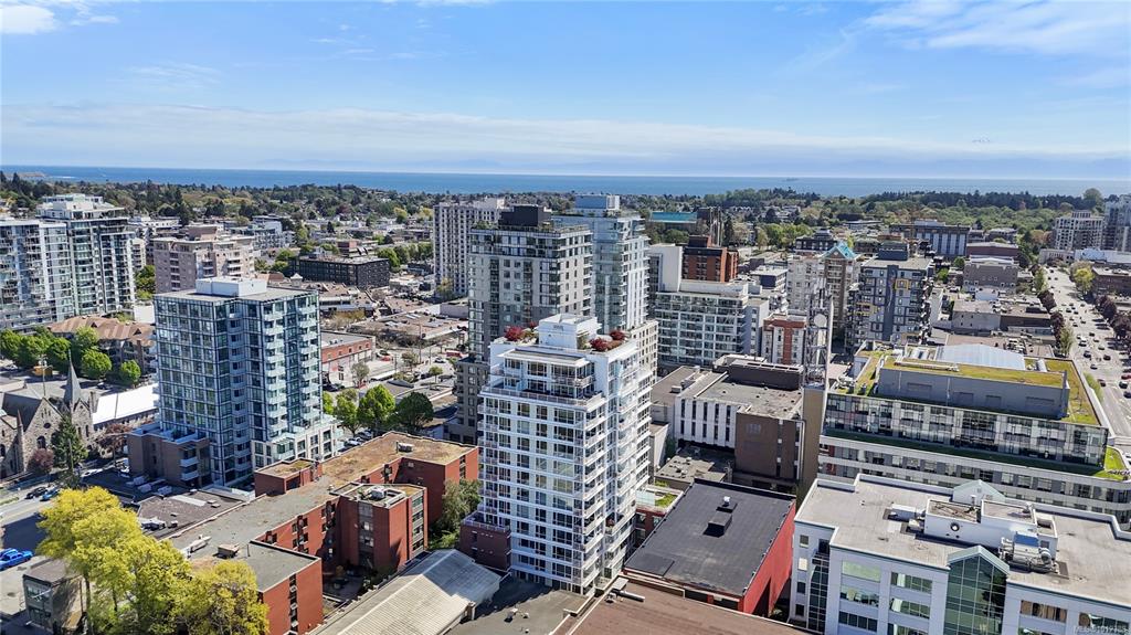 Live steps from everything in this modern 2 bedroom,1 bath condo set in a quality steel-and-concrete building in the vibrant core of downtown Victoria. Soaring 9-ft ceilings, floor-to-ceiling windows, engineered hardwood floors, and a sleek kitchen with quartz countertops and stainless steel appliances create a polished, contemporary feel. The open-concept living space flows to a covered balcony—ideal for morning coffee or winding down with city views. Bedrooms are thoughtfully separated, offering great fle...