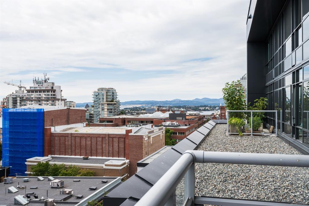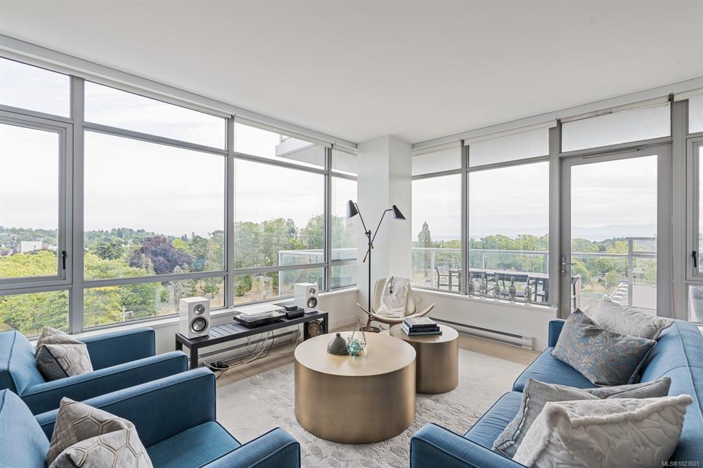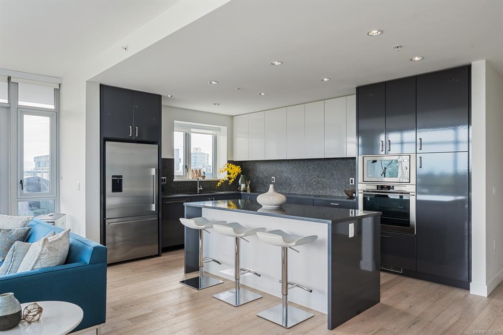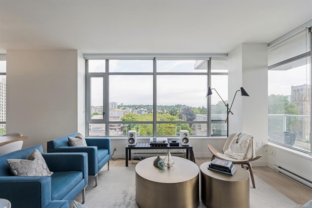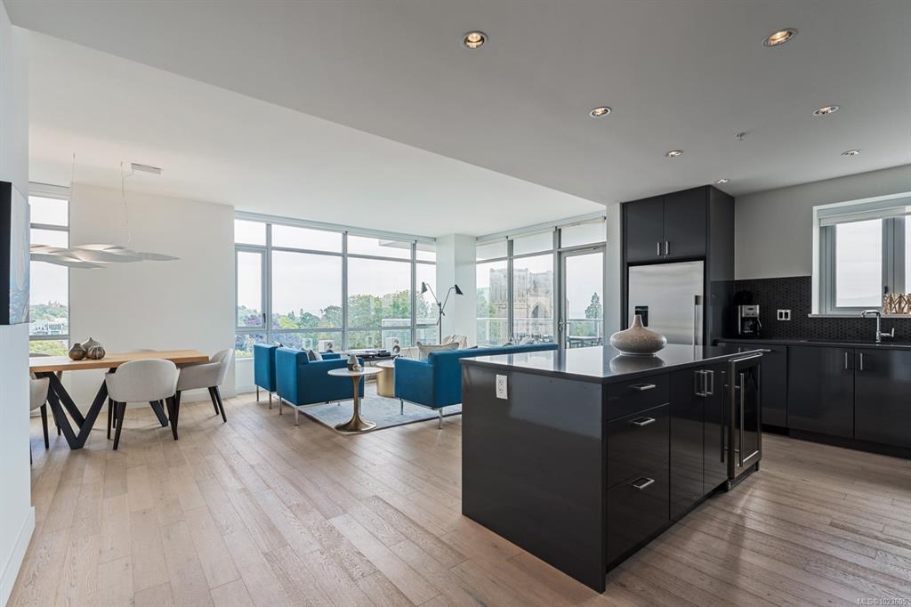 This stunning sub-penthouse at The Escher offers 2 spacious bedrooms, 2 full baths, a large den, and over 1,300 sq ft of refined living space. Enjoy breathtaking panoramic views of the Pacific Ocean, Olympic Mountains, and downtown Victoria through expansive floor-to-ceiling windows. The open layout features 9' ceilings, a gourmet kitchen with quartz counters, induction cooktop, wine fridge, and enough space for hosting. The primary suite includes a spa-inspired ensuite with soaker tub, walk-in shower, heat...
