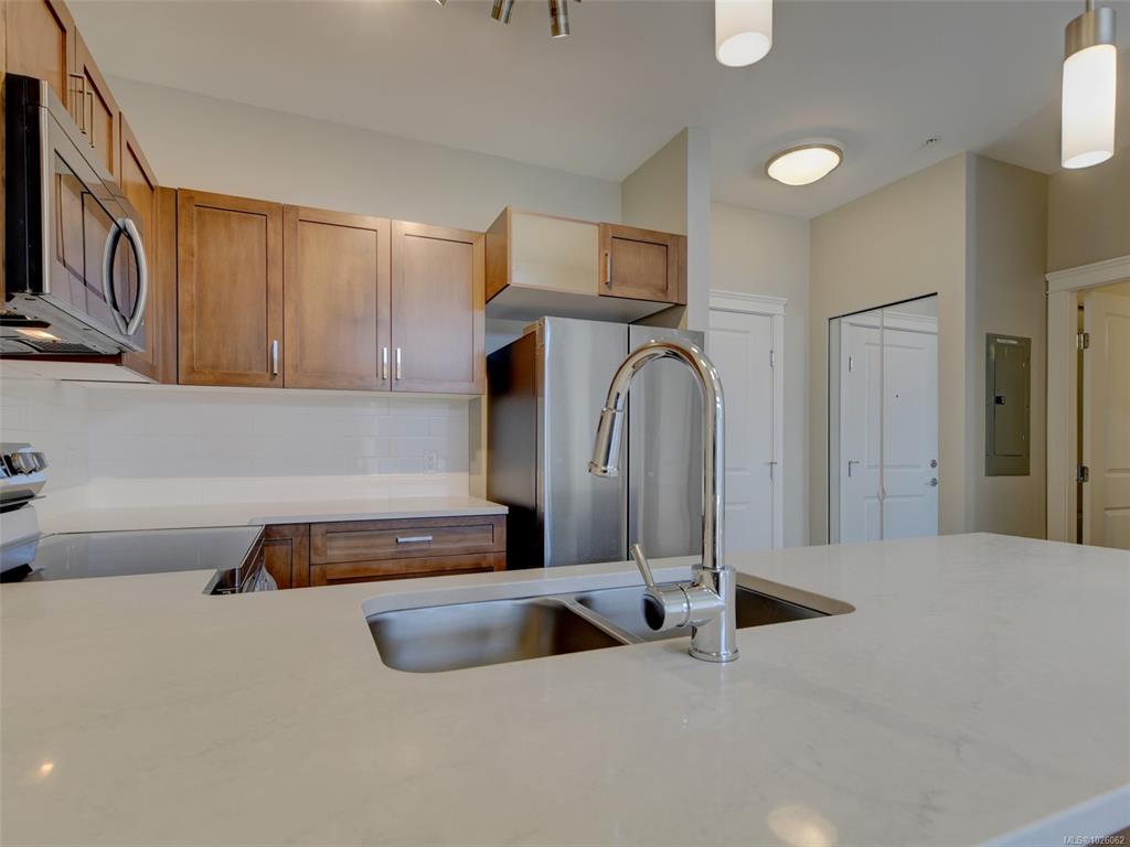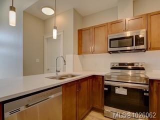 It’s all about lifestyle and convenience in this beautifully updated TOP FLOOR modern condo in the heart of Langford! The moment you enter, you will understand why this unit is special and appreciate the soaring 12 foot high vaulted ceilings. Large windows ensure abundant natural light while overlooking a peaceful green space. Stylish open plan kitchen with quartz countertops, high end appliances and an array of upgrades. Sleek new flooring. Generous sized master bedroom with double closets and luxurious en...
