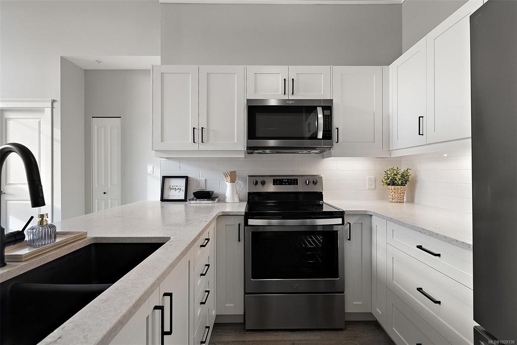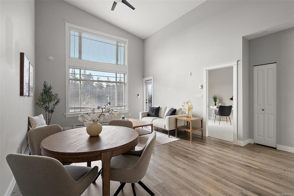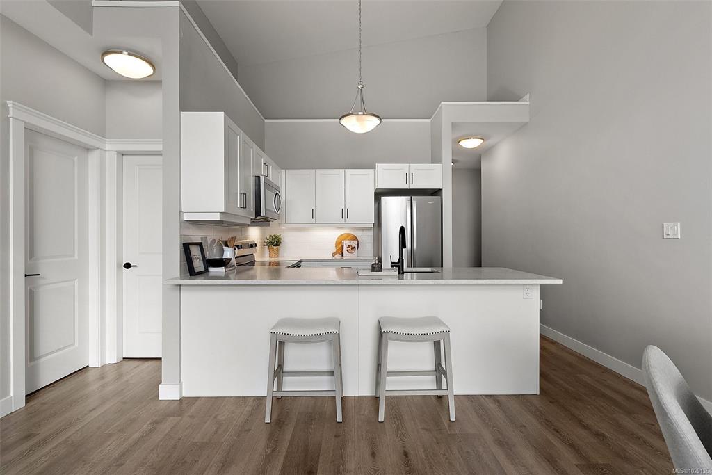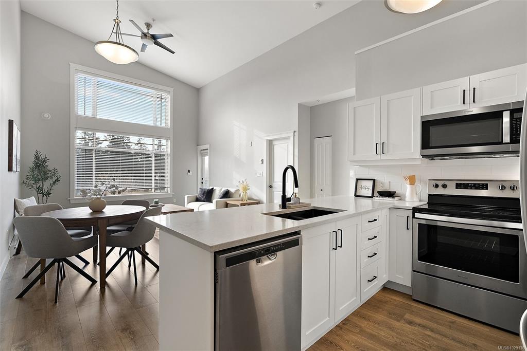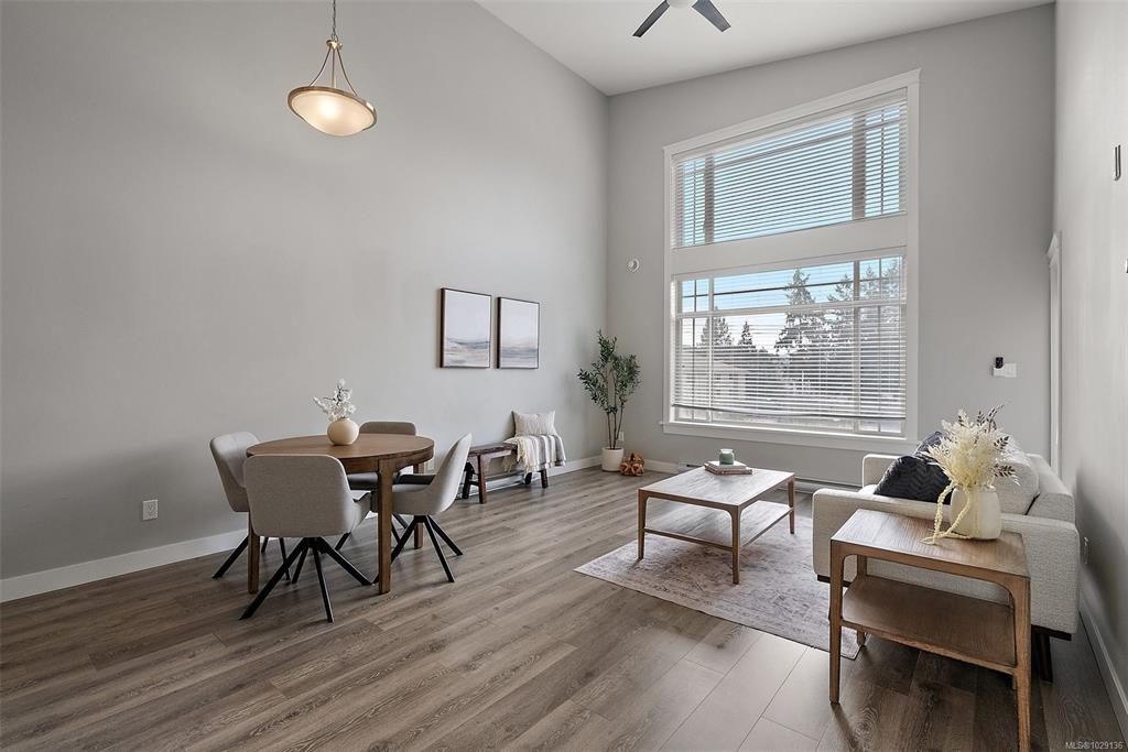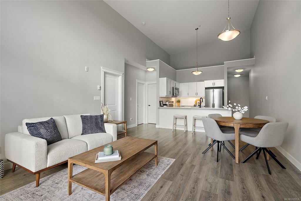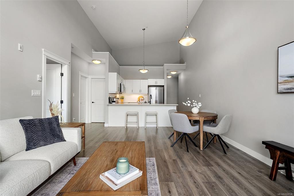 OPEN HOUSE SAT MAR 21 12:00-1:30pm. Top-floor and one of the largest units in the building, this 2-bedroom, 2-bathroom condo at 844 Goldstream Avenue is located in the heart of Langford and showcases impressive 17-foot vaulted ceilings with a bright, open-concept living, dining, and kitchen layout. Large windows flood the home with natural light, creating an airy and welcoming atmosphere. The spacious kitchen offers quartz countertops, newer appliances, and an eat-in island—ideal for everyday living and ent...