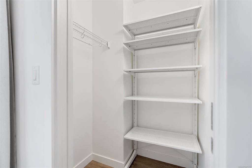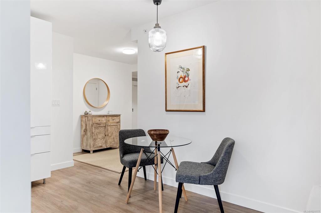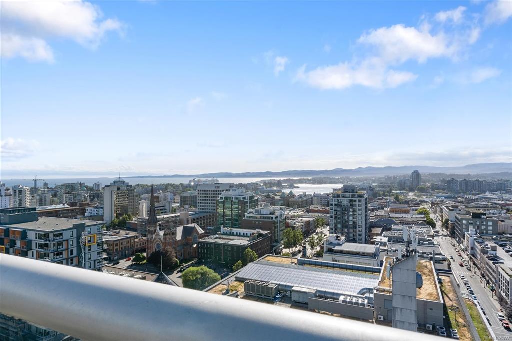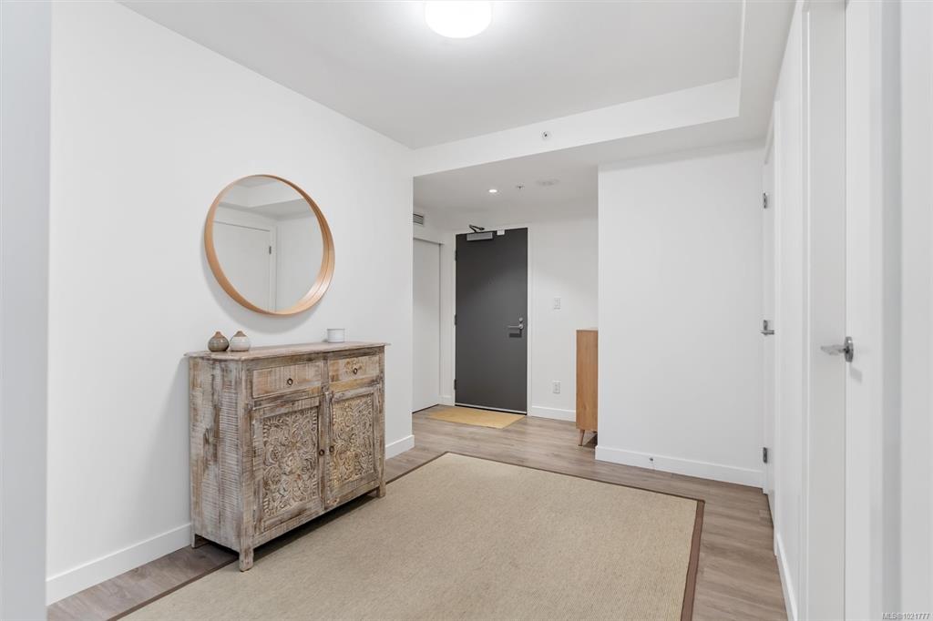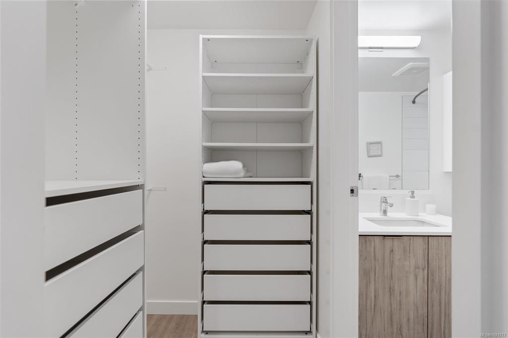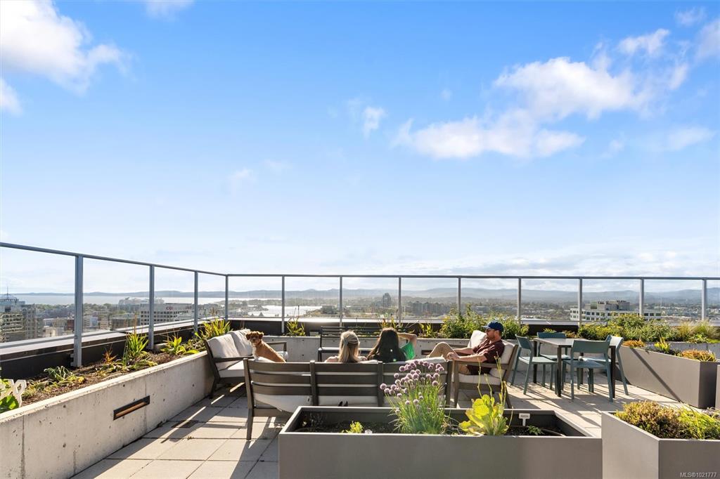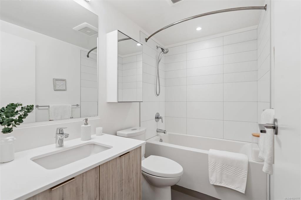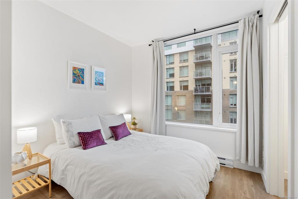 Spacious 6th floor 2 Bed, 2 Bath corner suite with south facing garden views, tucked away from street, in the heart of downtown Victoria. Primary bedroom features ensuite with soaker tub and walk in closet; second bedroom offers two large closets and nearby full bath. Smart layout separates bedrooms with open living space and ample storage. Bright kitchen with quartz counters, modern cabinetry, honeycomb backsplash, stainless appliances, long eating bar, and dining area. Large entry doubles as flexible spac...