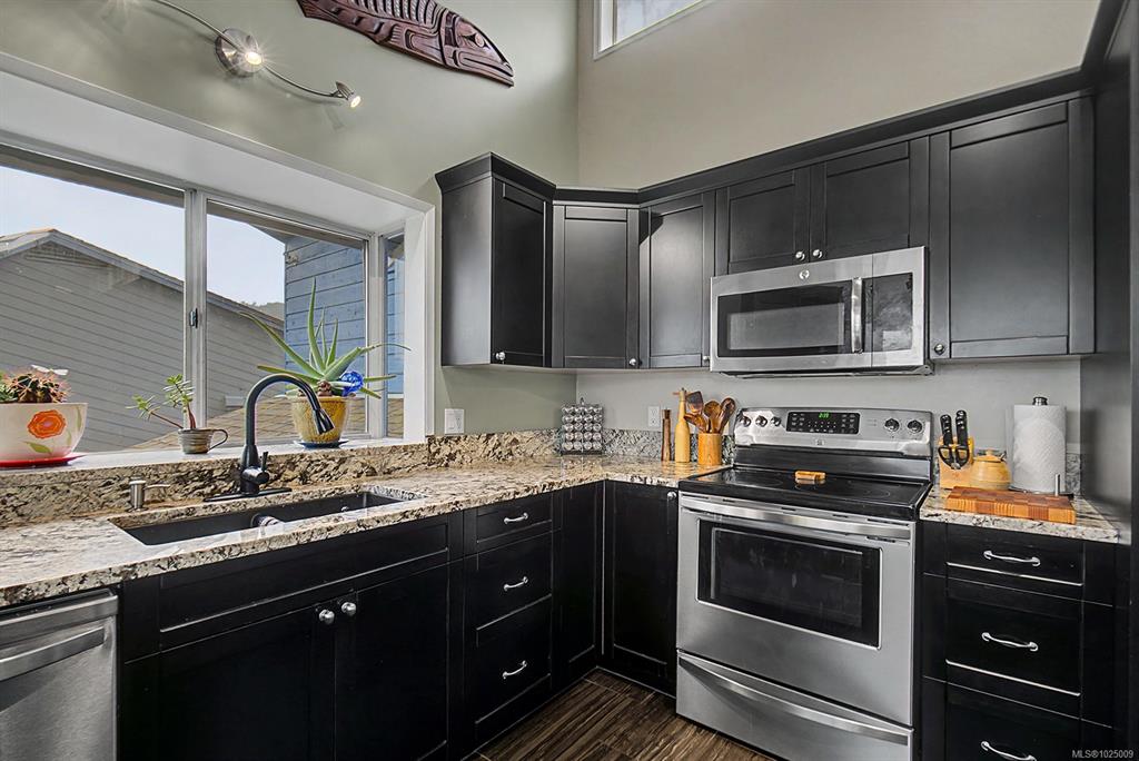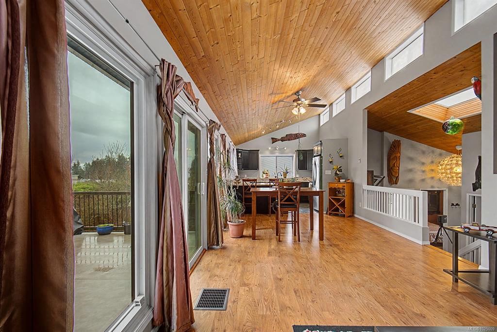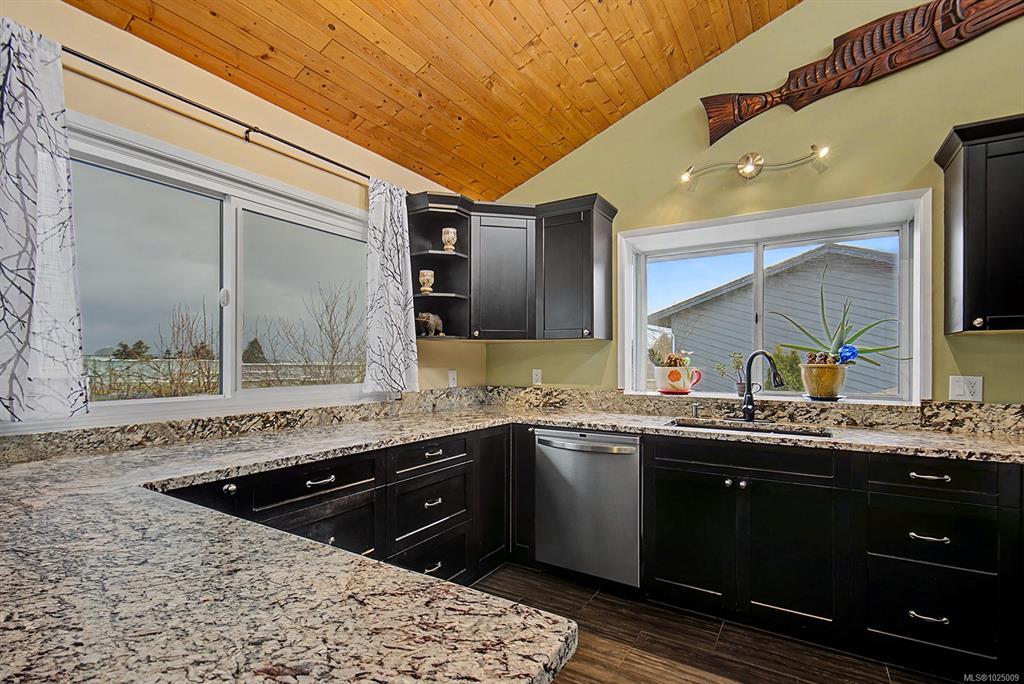 This 3-bed, 3-bath home backs directly onto Ladysmith Secondary School, giving you rare privacy and an open, expansive backdrop you don’t often find in town. From the moment you step inside, you’ll notice what truly sets this home apart: soaring wood-vaulted ceilings paired with clerestory windows that flood the space with natural light. Most windows throughout the home have been replaced with triple-pane windows, offering improved energy efficiency and year-round comfort. The updated kitchen features grani...