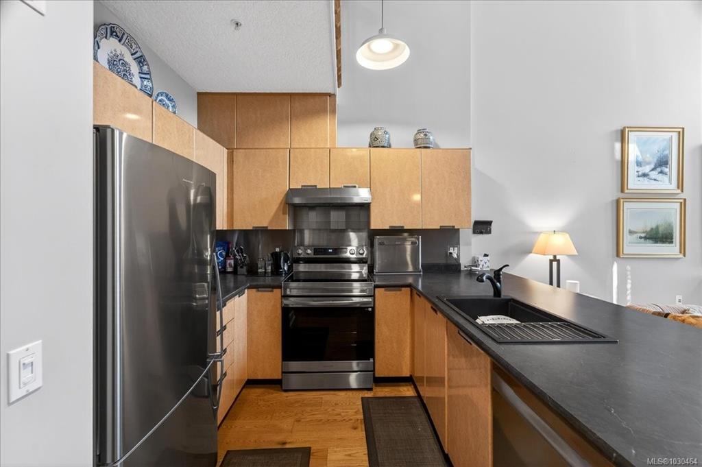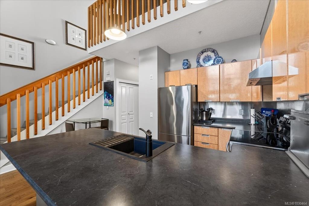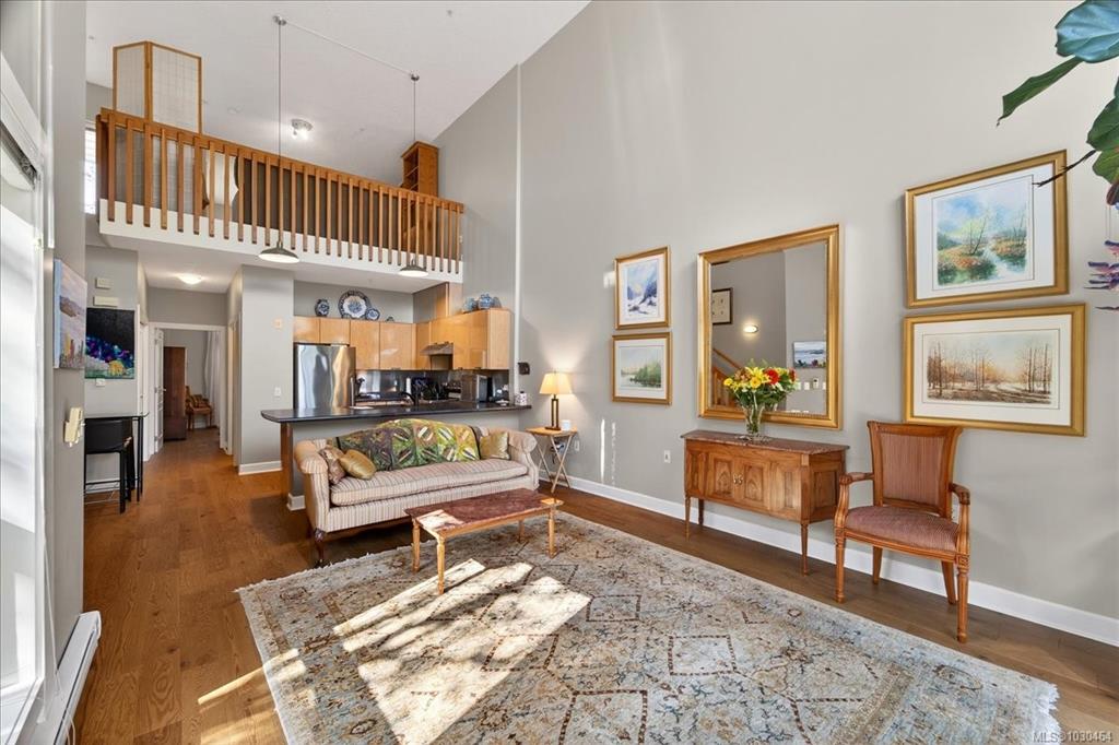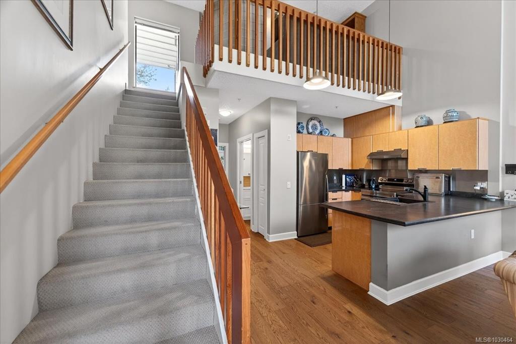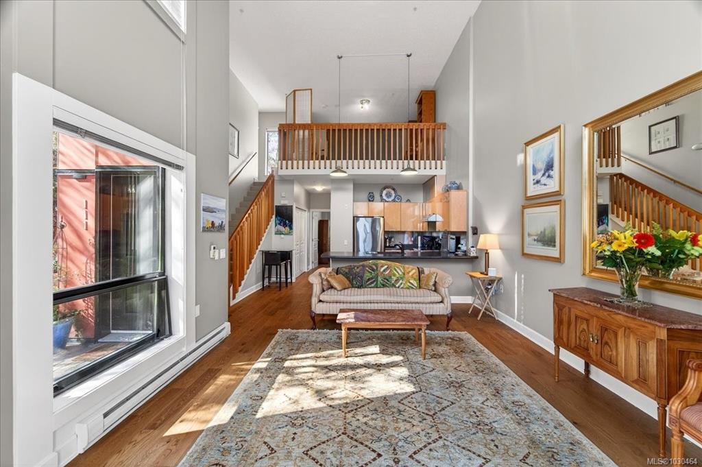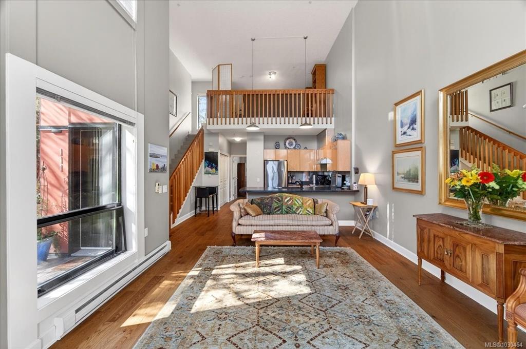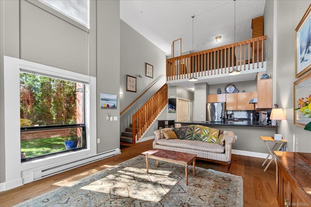 Location!! Bright end-unit loft-style townhome across from Uptown Shopping Centre. Built in 2005, this 2-storey home offers 2 bedrooms, 2 bathrooms over 1,074 sq ft with soaring 17+ ft floor-to-ceiling windows. Open-concept living with vaulted ceilings, wood floors, functional kitchen with custom cabinetry, pantry, quality appliances & eating area. Main floor features a generous bedroom with large windows and extra-large closets plus a 4-piece bath. Upstairs offers a spacious loft-style primary with office ...