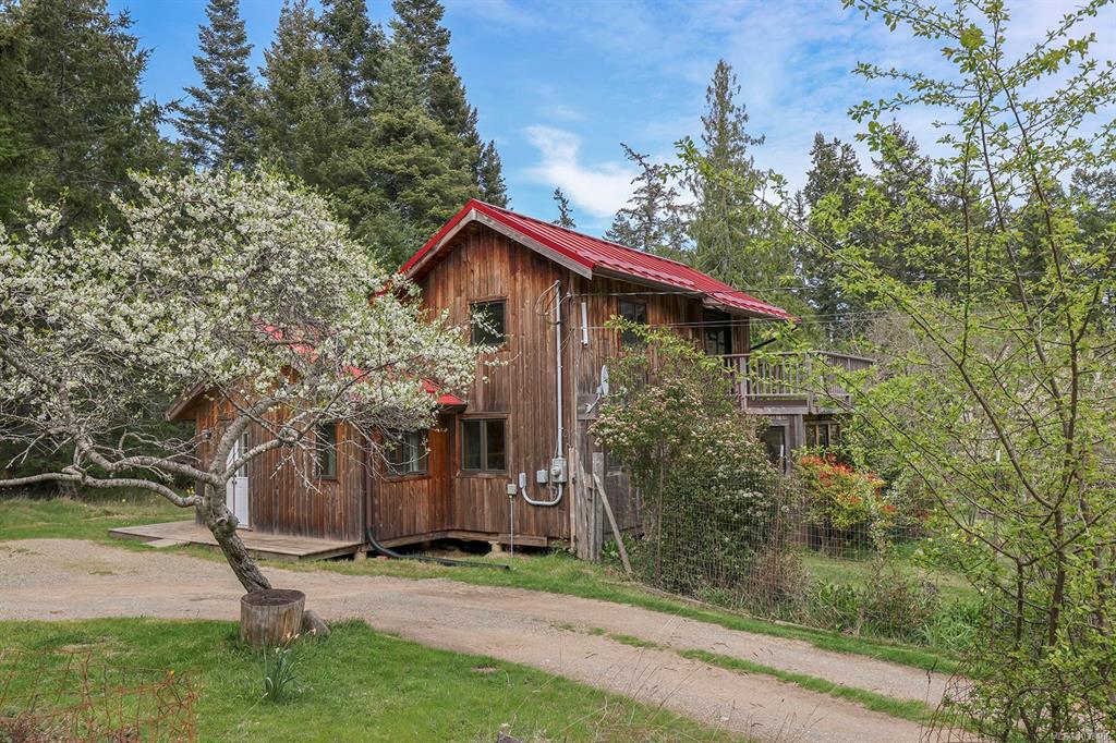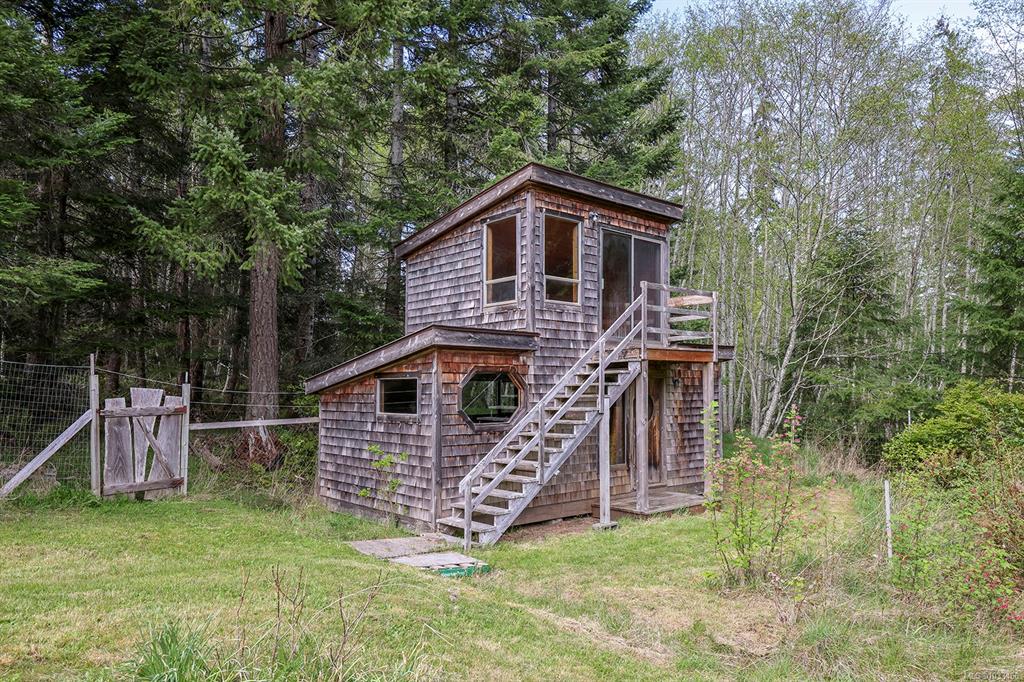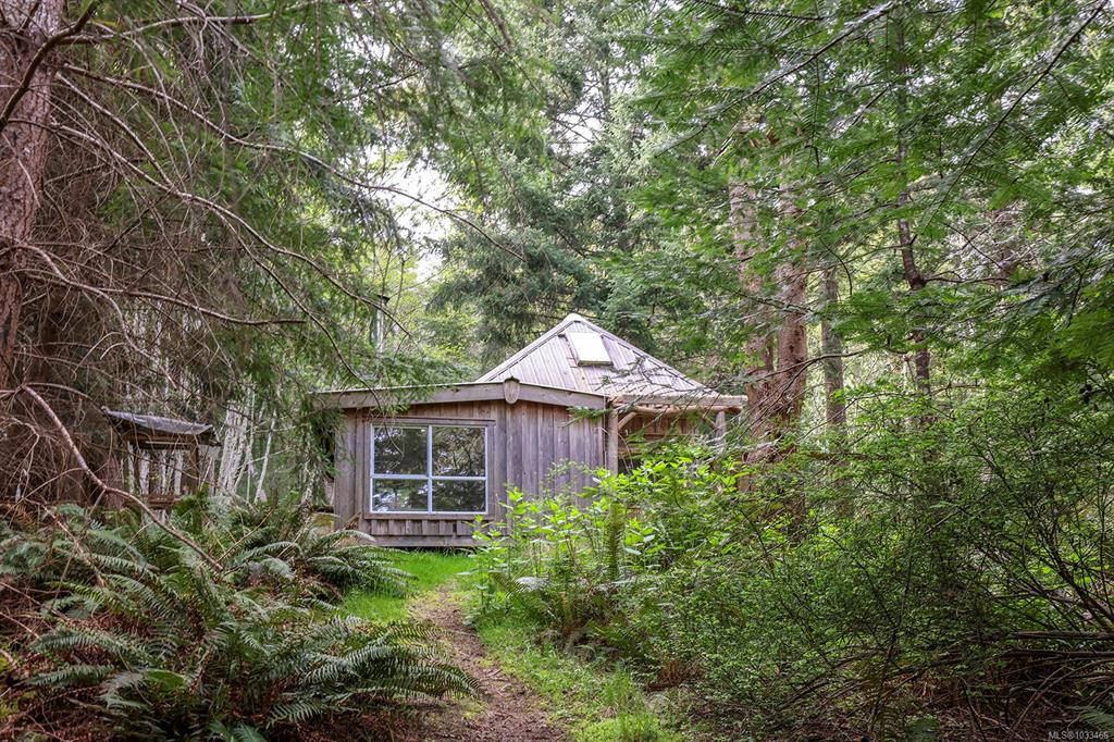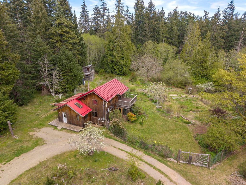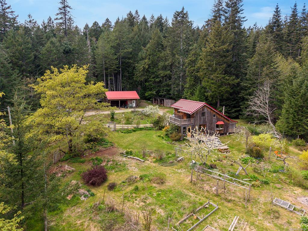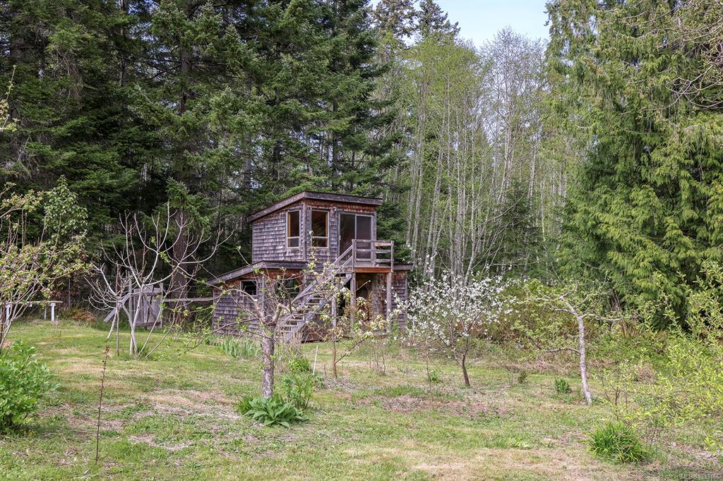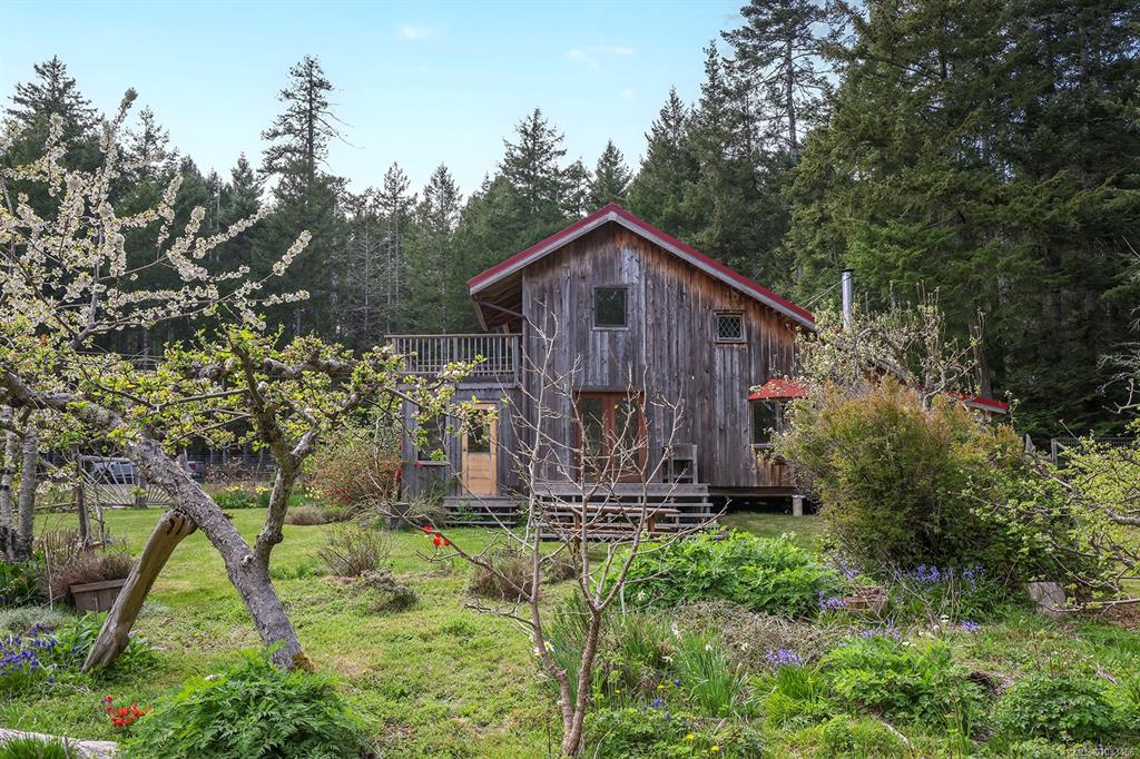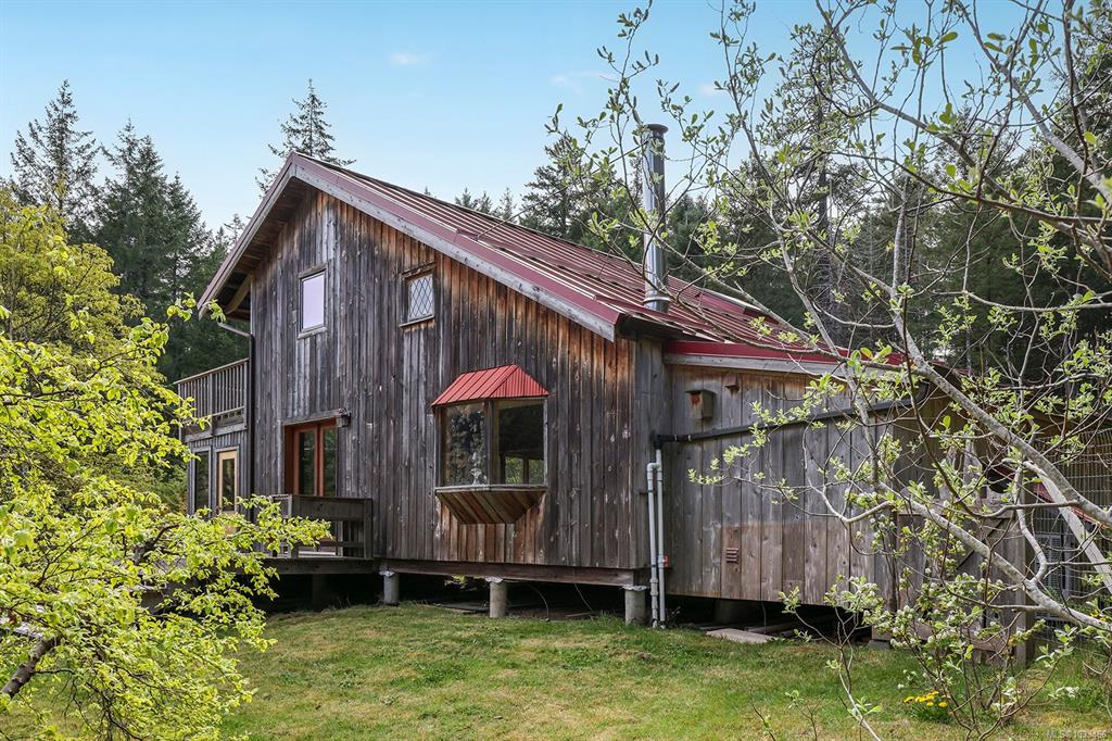 Five and three-quarter private acres on Denman Island, south-facing, with a wooded perimeter opening to cleared, cultivated ground. The 1981 main house has genuine handcrafted character: vaulted post-and-beam living space, wood-paneled ceilings with an inlaid star detail, log-rail staircase to the upper level, two bedrooms, one bath, and a kitchen with custom wood cabinetry and stone countertops. Two wood stoves, metal roof, electric baseboard backup. The property also includes an octagonal sleeping cabin w...