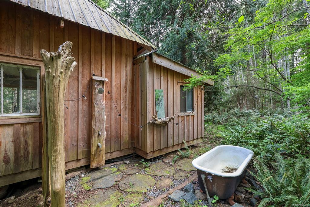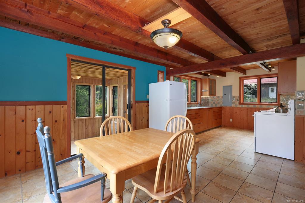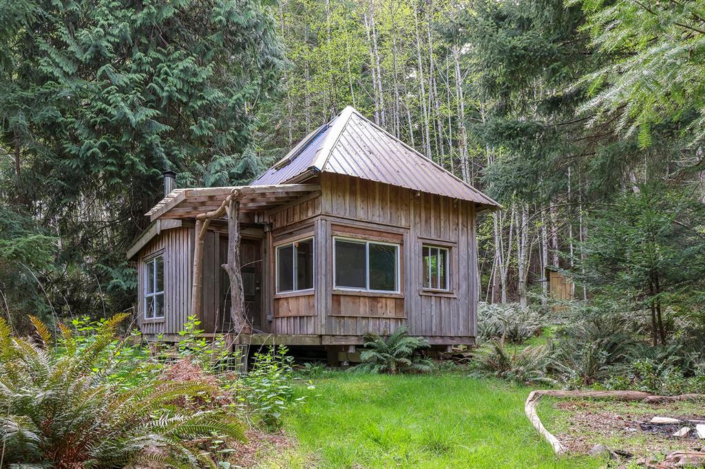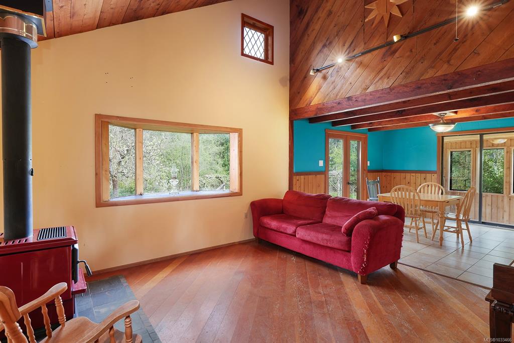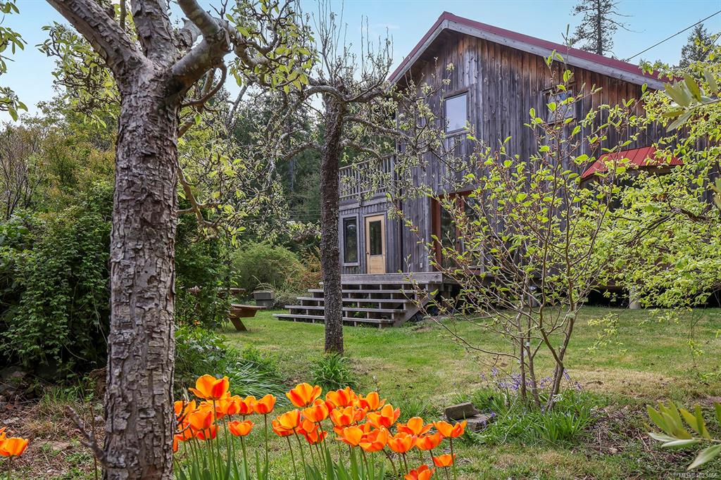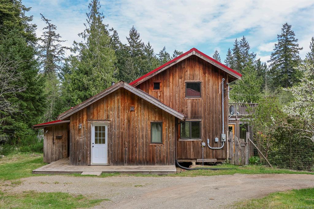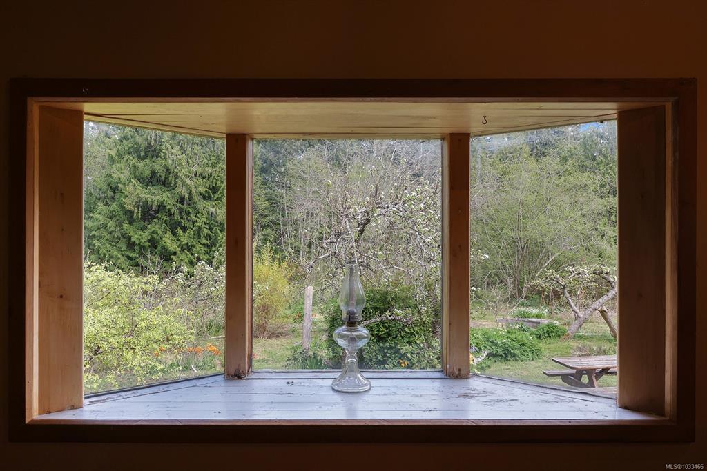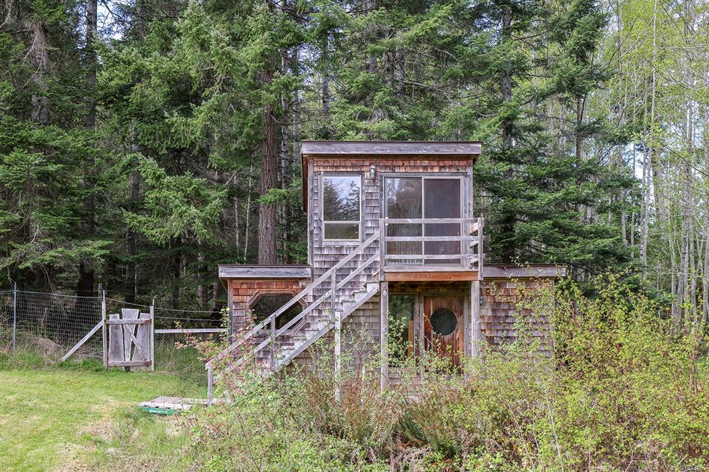 Five and three-quarter private acres on Denman Island, south-facing, with a wooded perimeter opening to cleared, cultivated ground. The 1981 main house has genuine handcrafted character: vaulted post-and-beam living space, wood-paneled ceilings with an inlaid star detail, log-rail staircase to the upper level, two bedrooms, one bath, and a kitchen with custom wood cabinetry and stone countertops. Two wood stoves, metal roof, electric baseboard backup. The property also includes an octagonal sleeping cabin w...