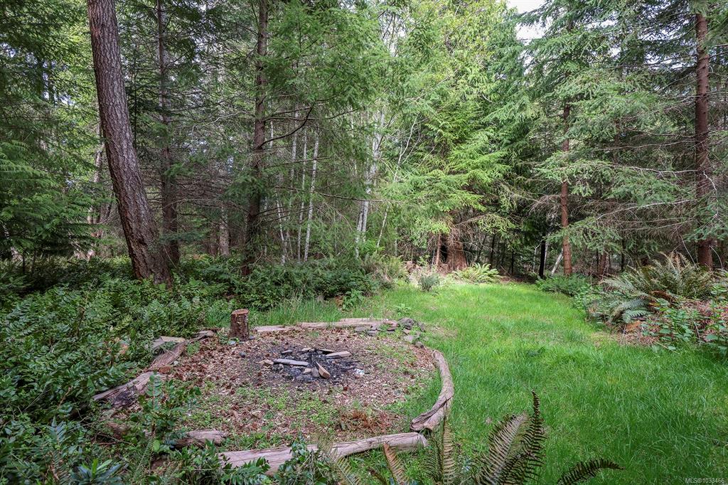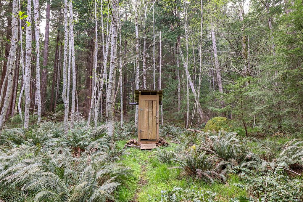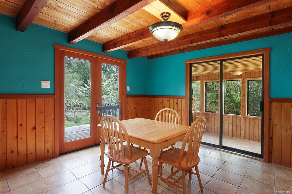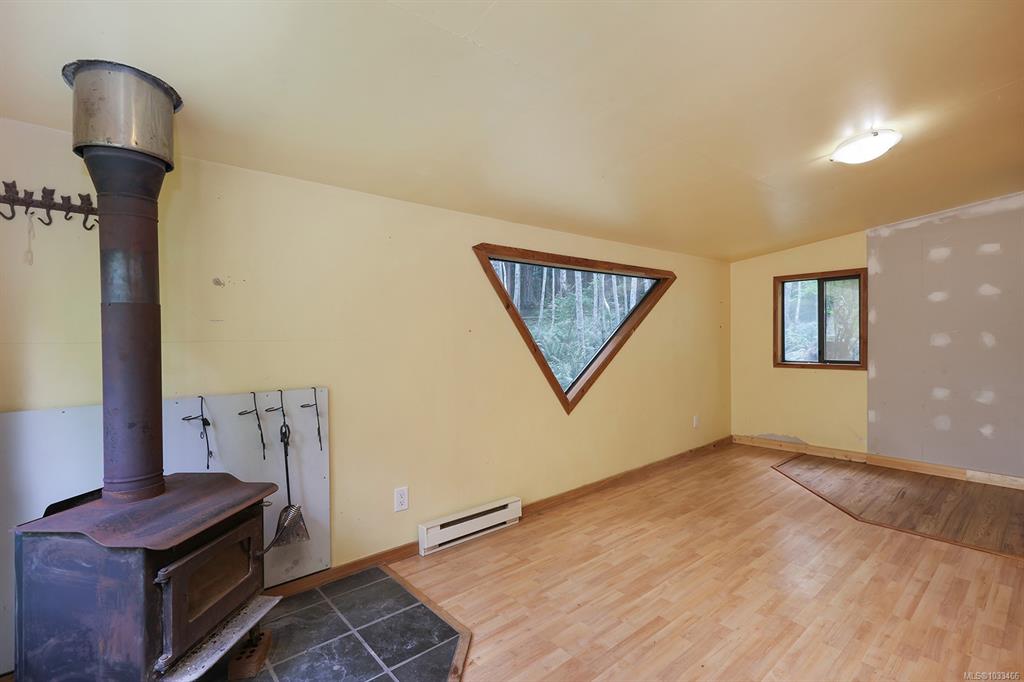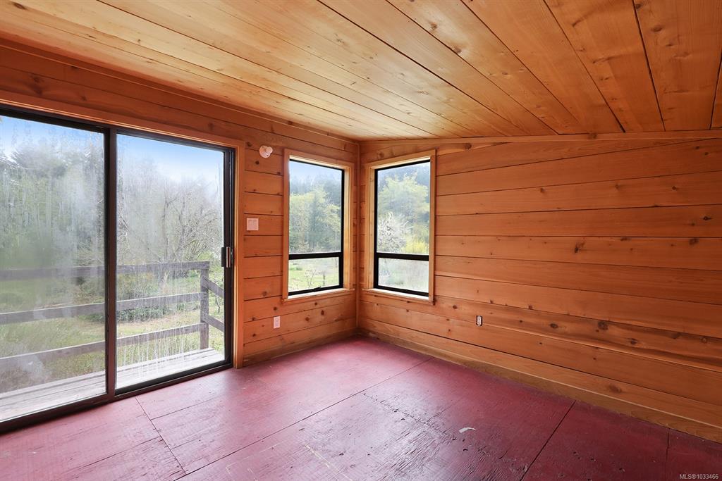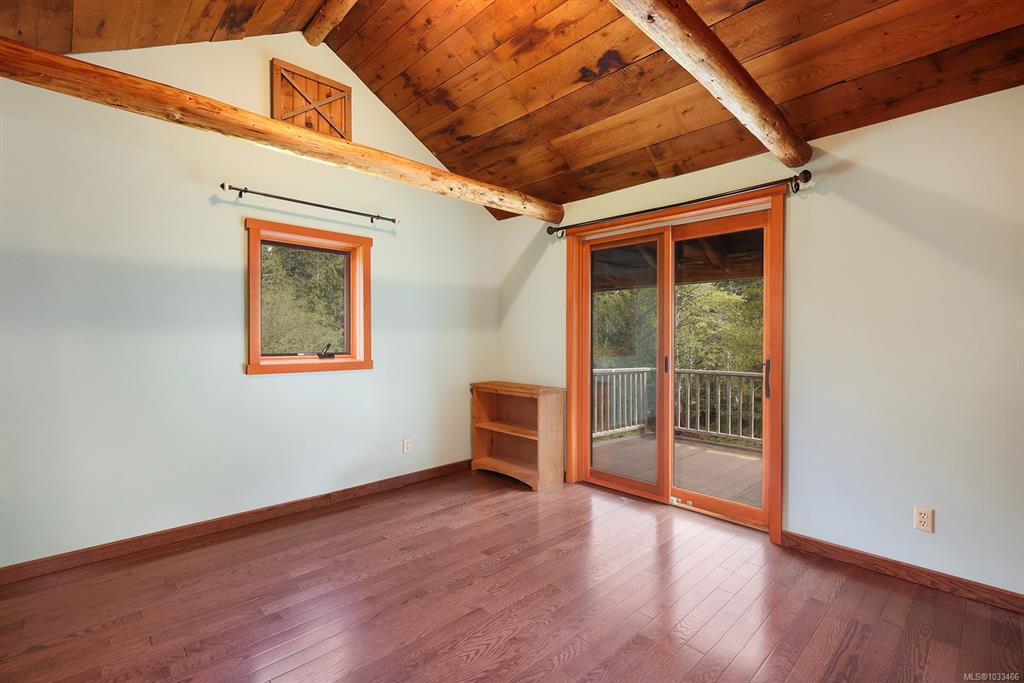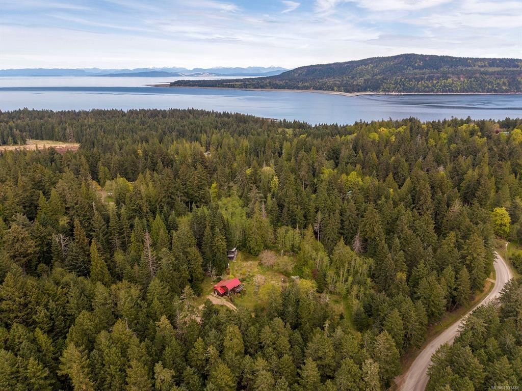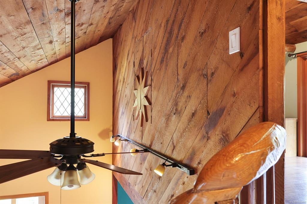 Five and three-quarter private acres on Denman Island, south-facing, with a wooded perimeter opening to cleared, cultivated ground. The 1981 main house has genuine handcrafted character: vaulted post-and-beam living space, wood-paneled ceilings with an inlaid star detail, log-rail staircase to the upper level, two bedrooms, one bath, and a kitchen with custom wood cabinetry and stone countertops. Two wood stoves, metal roof, electric baseboard backup. The property also includes an octagonal sleeping cabin w...