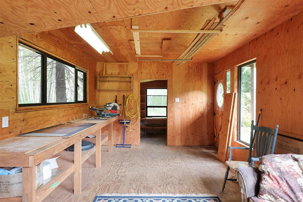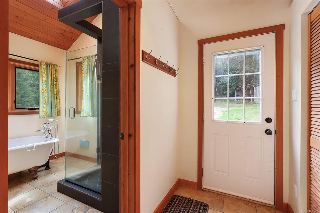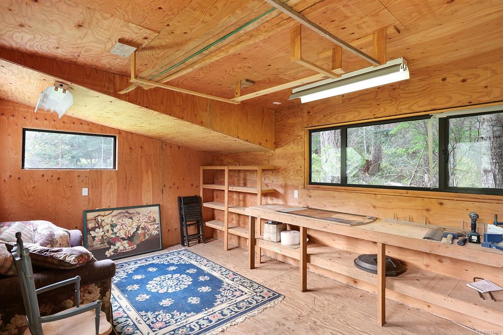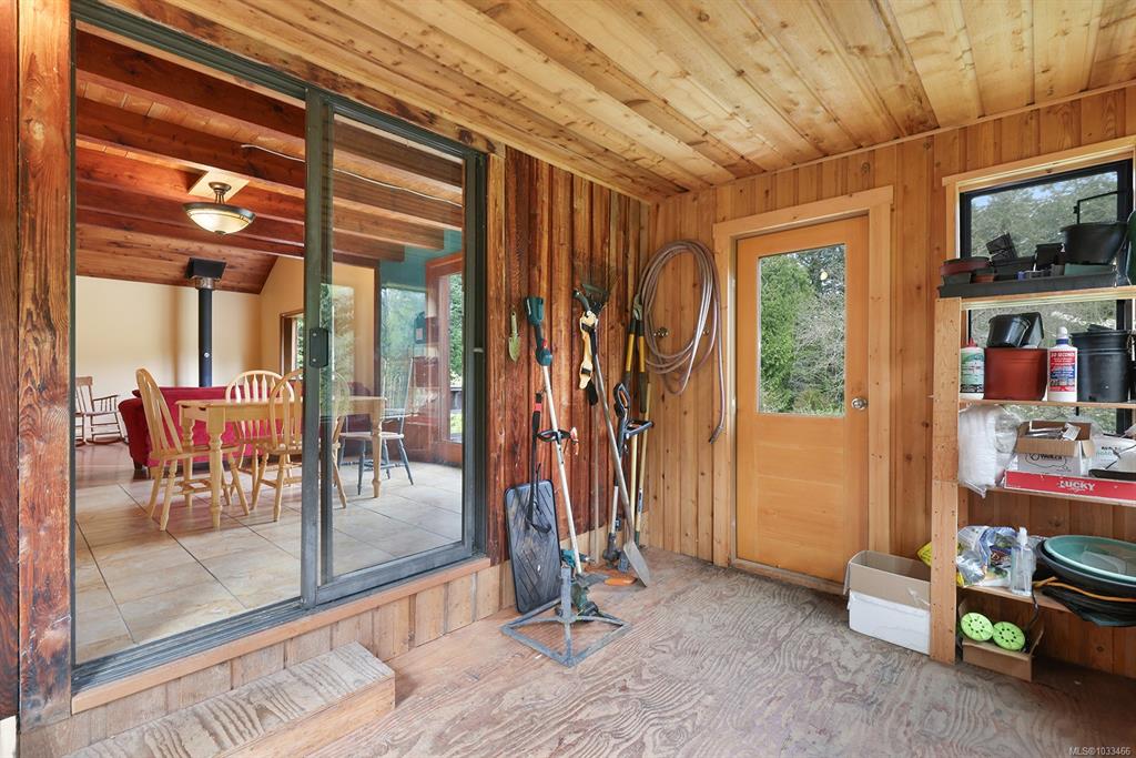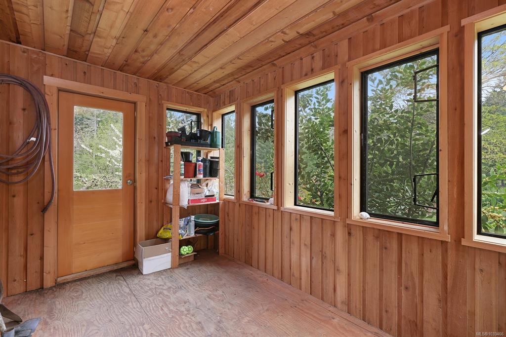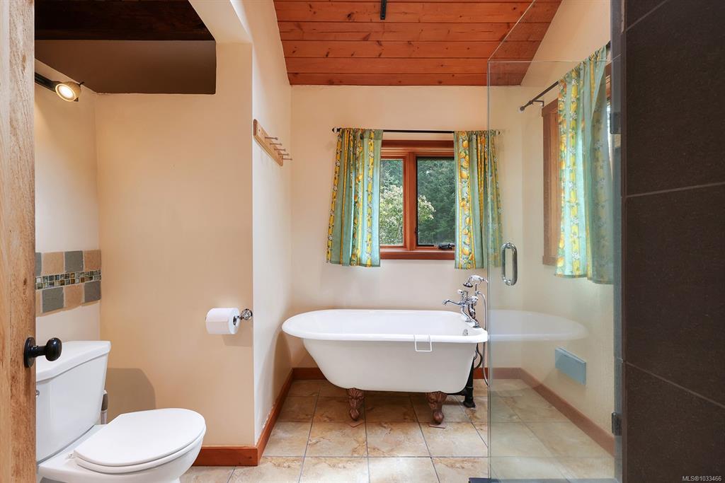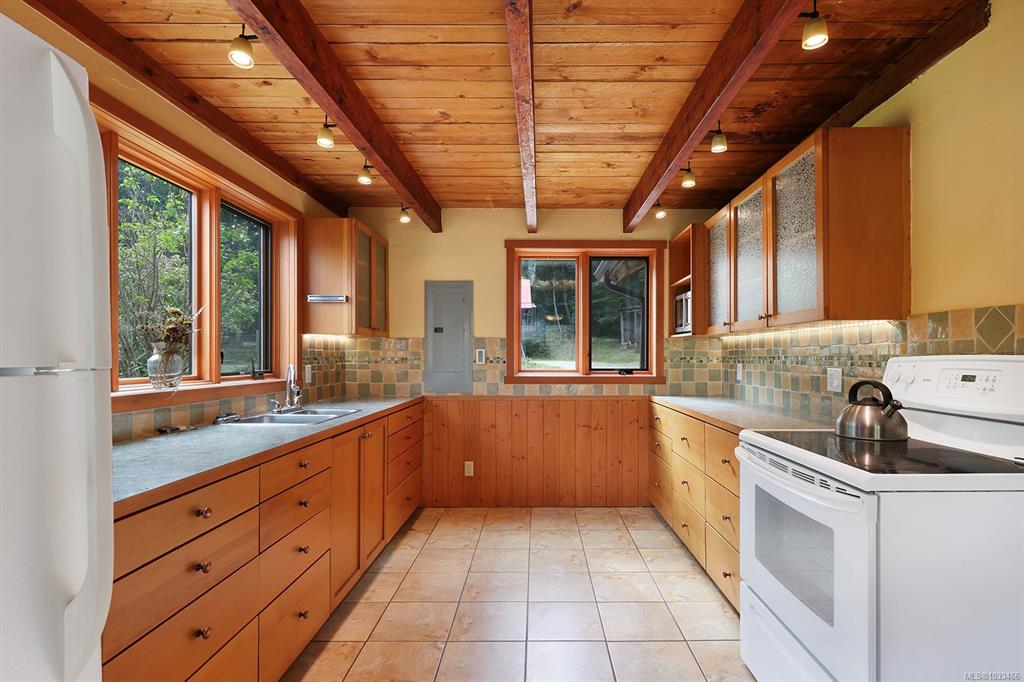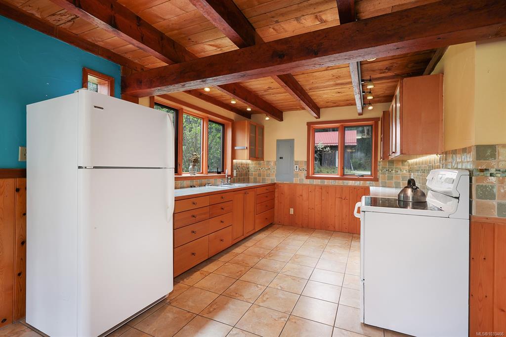 Five and three-quarter private acres on Denman Island, south-facing, with a wooded perimeter opening to cleared, cultivated ground. The 1981 main house has genuine handcrafted character: vaulted post-and-beam living space, wood-paneled ceilings with an inlaid star detail, log-rail staircase to the upper level, two bedrooms, one bath, and a kitchen with custom wood cabinetry and stone countertops. Two wood stoves, metal roof, electric baseboard backup. The property also includes an octagonal sleeping cabin w...