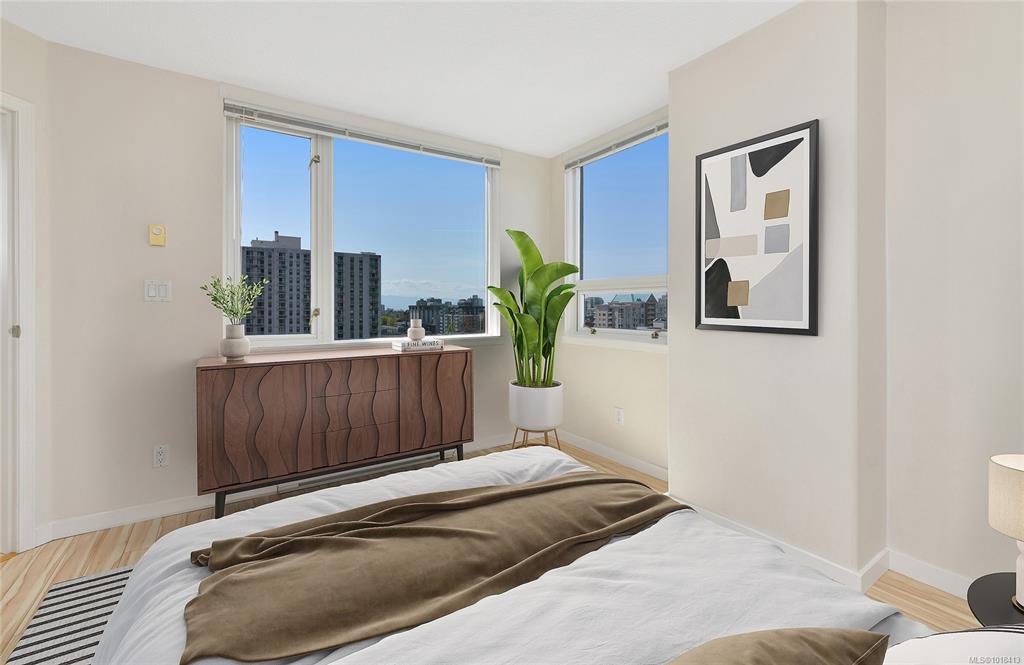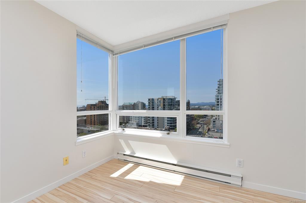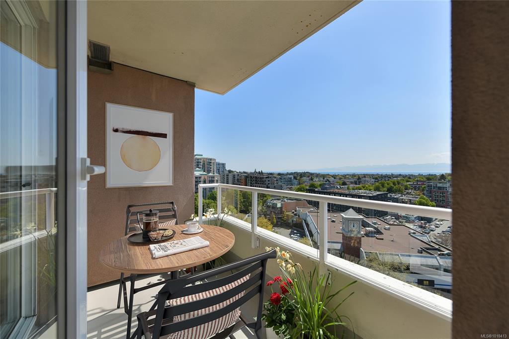 Enjoy the Best Priced 2 bedroom condo in an urban living at its finest in this downtown unit perched on the 12th floor of a solid steel and concrete building. Soak in sweeping views of the city, Sooke Hills, water, and mountains from your private patio — the perfect spot for morning coffee or evening BBQs. Inside, the thoughtful layout includes in-suite laundry and a flexible second bedroom/den. The building offers great amenities including a gym and guest suite, and rentals are welcome, making this home id...