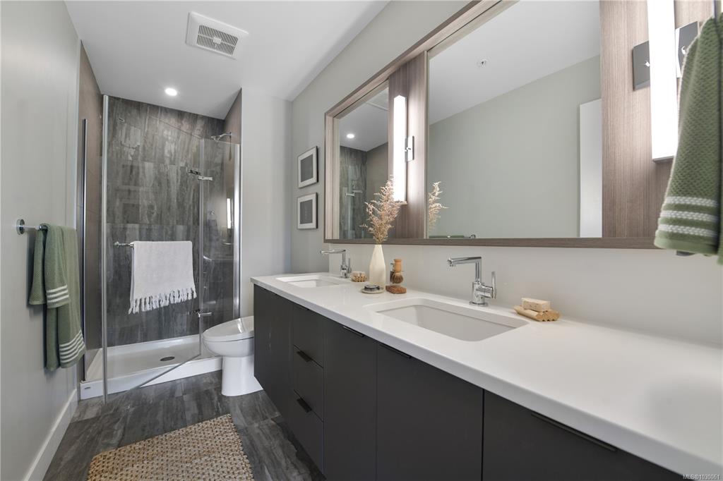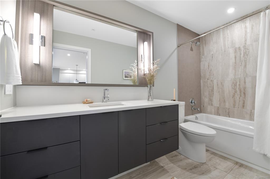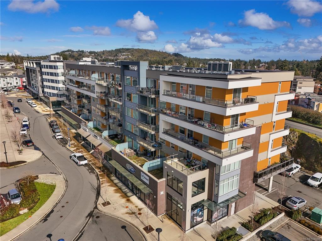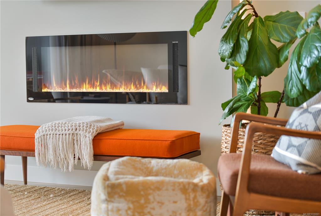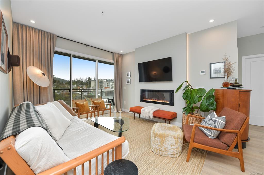 Welcome to this bright & beautifully appointed 2-bedroom, 2-bathroom condo on the quiet side of the building in the vibrant Florence Lake neighbourhood of Langford. This modern home offers an open-concept layout filled w natural light and lovely views. Chef-inspired kitchen features quartz countertops, stylish 2-toned cabinetry & premium appliances including a gas range. A striking back-lit fireplace creates a warm focal point in the living area, while the large covered balcony offers excellent privacy with...